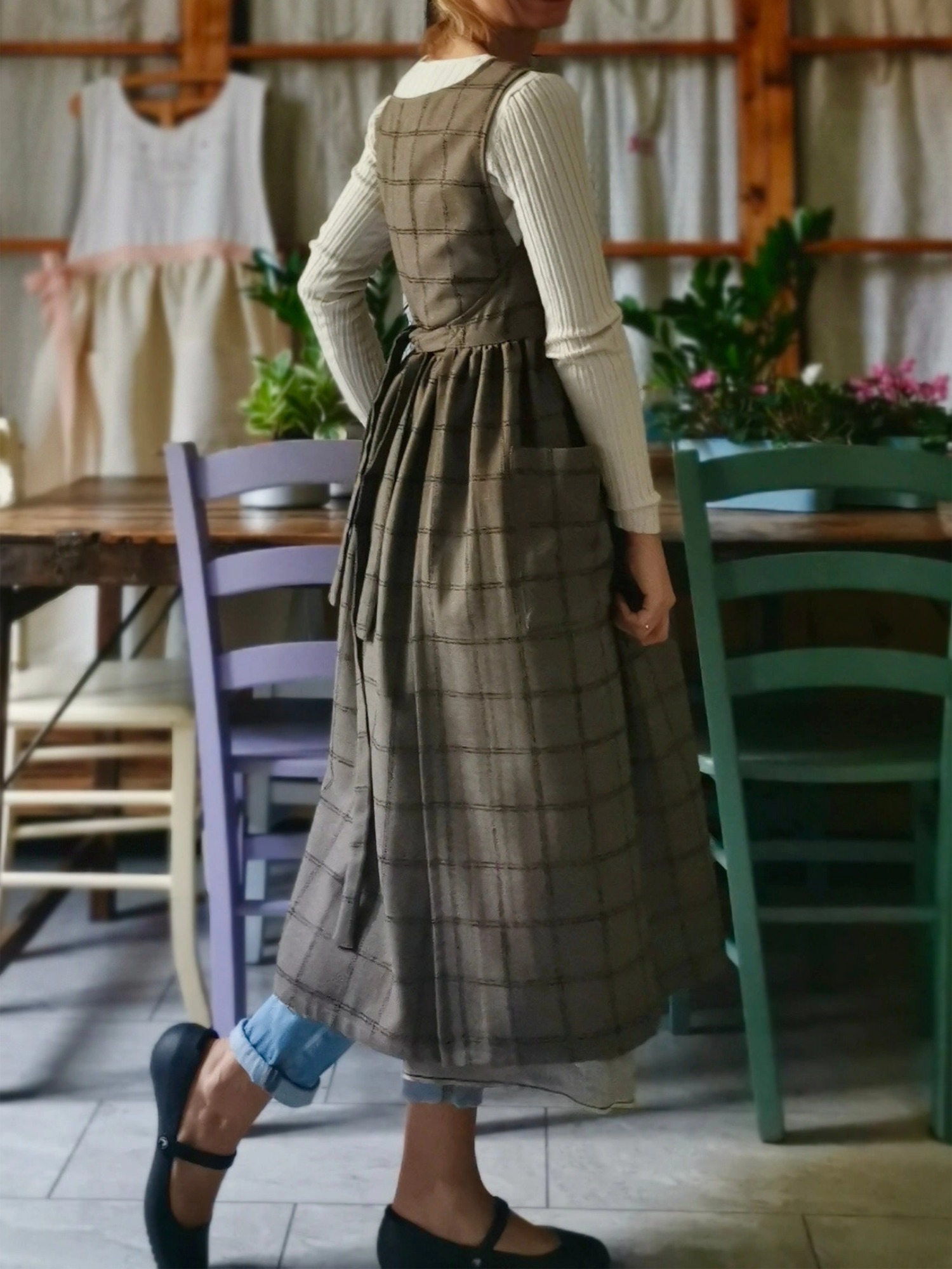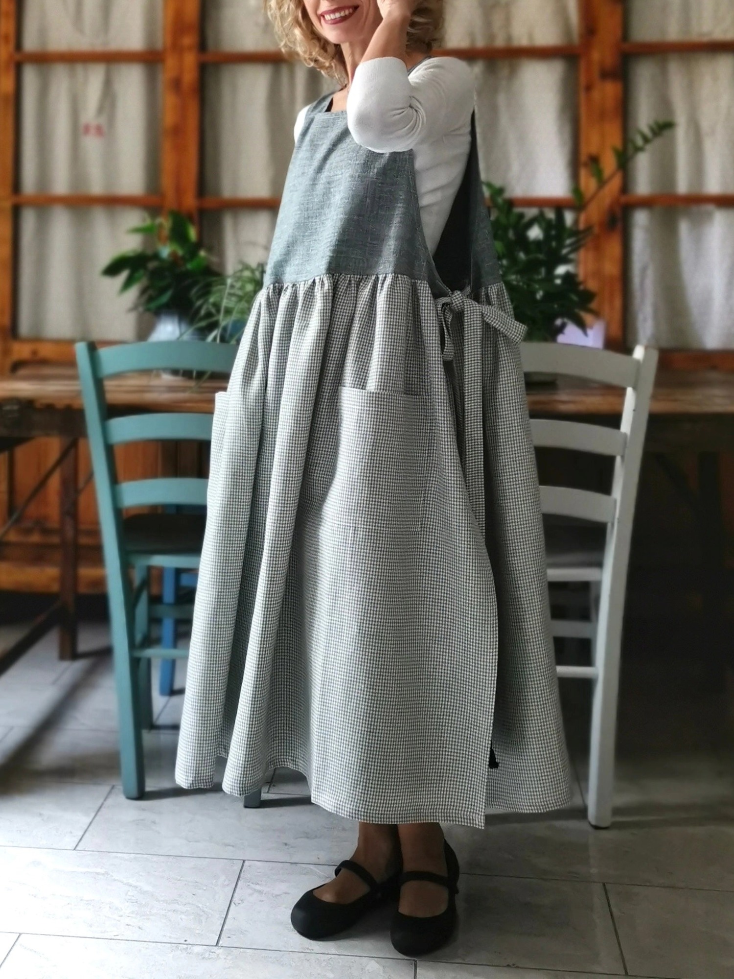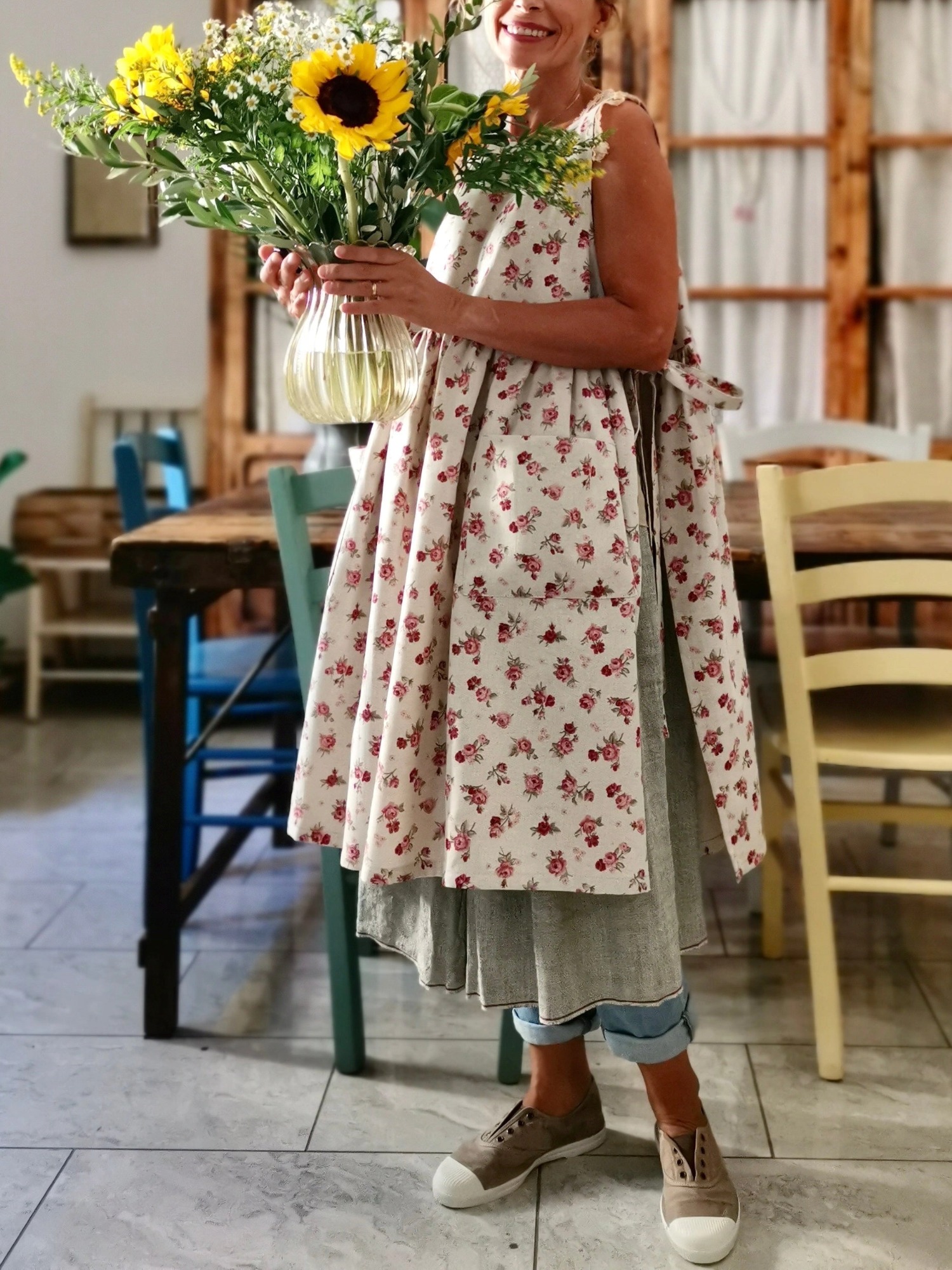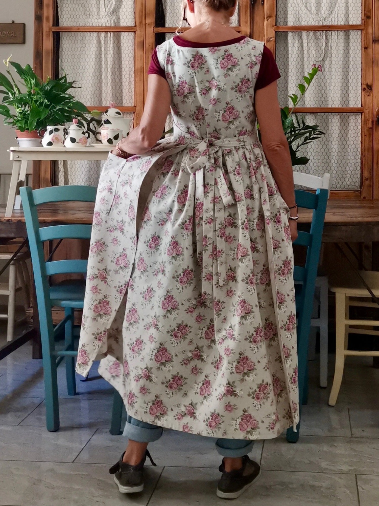 Vintage Grey Green Floral Print Long Apron with Pockets