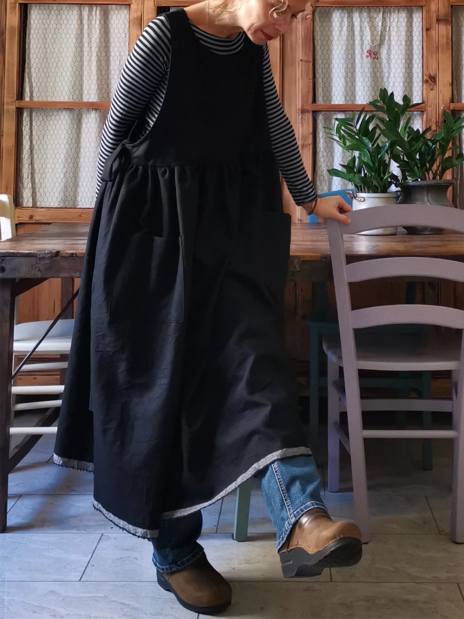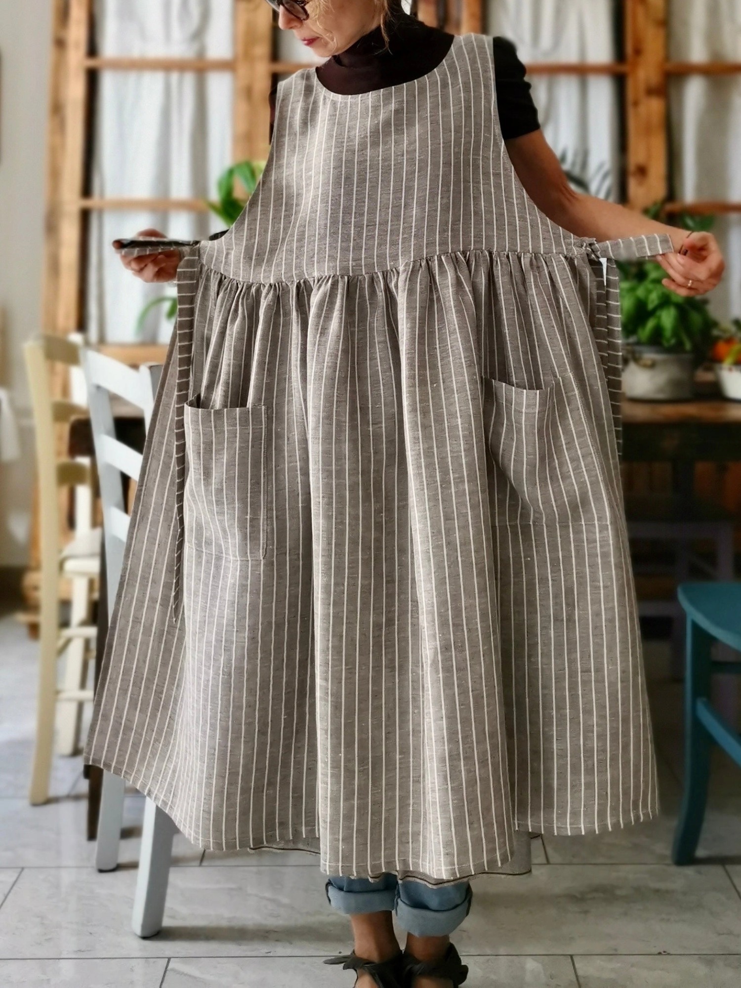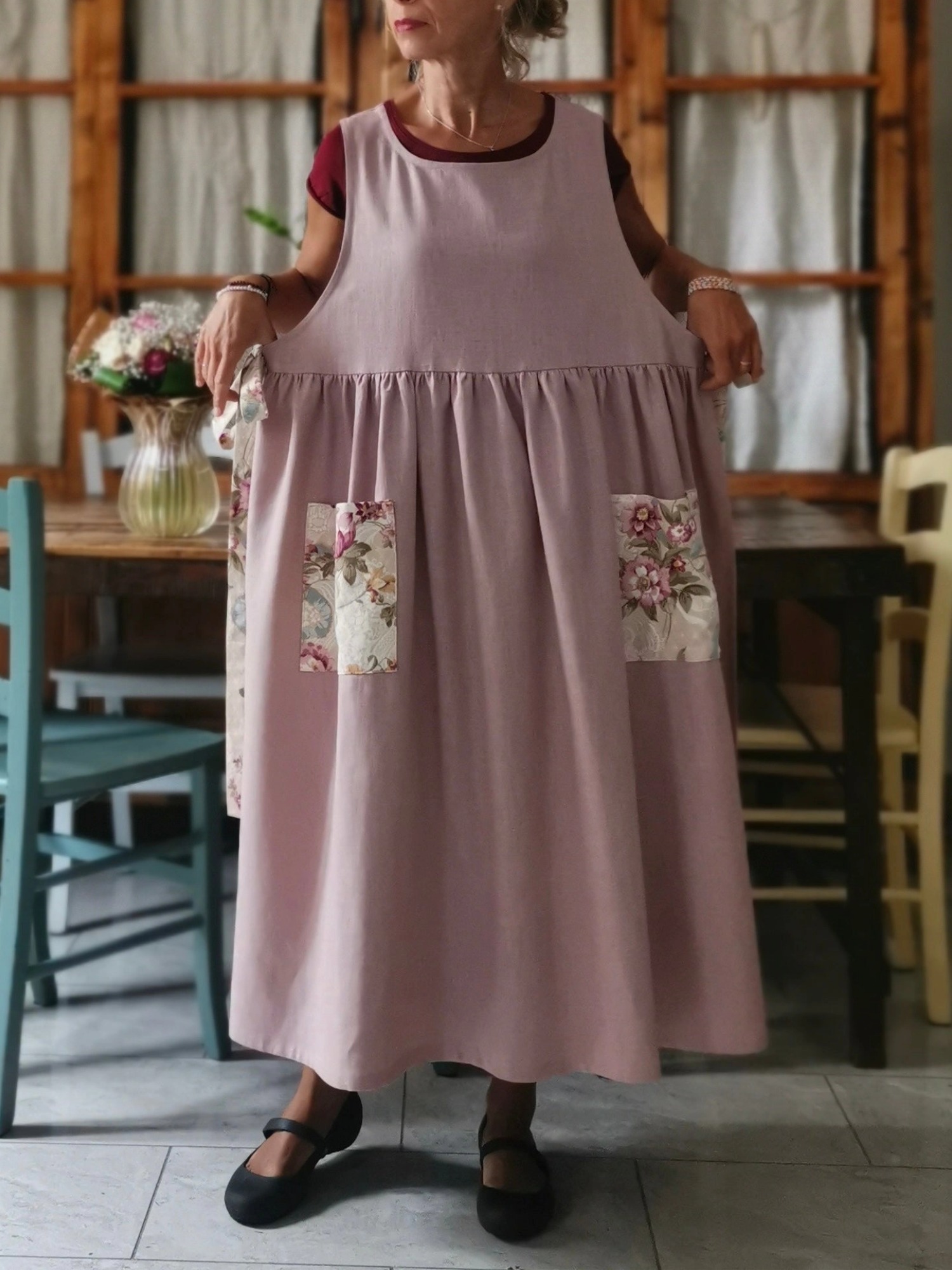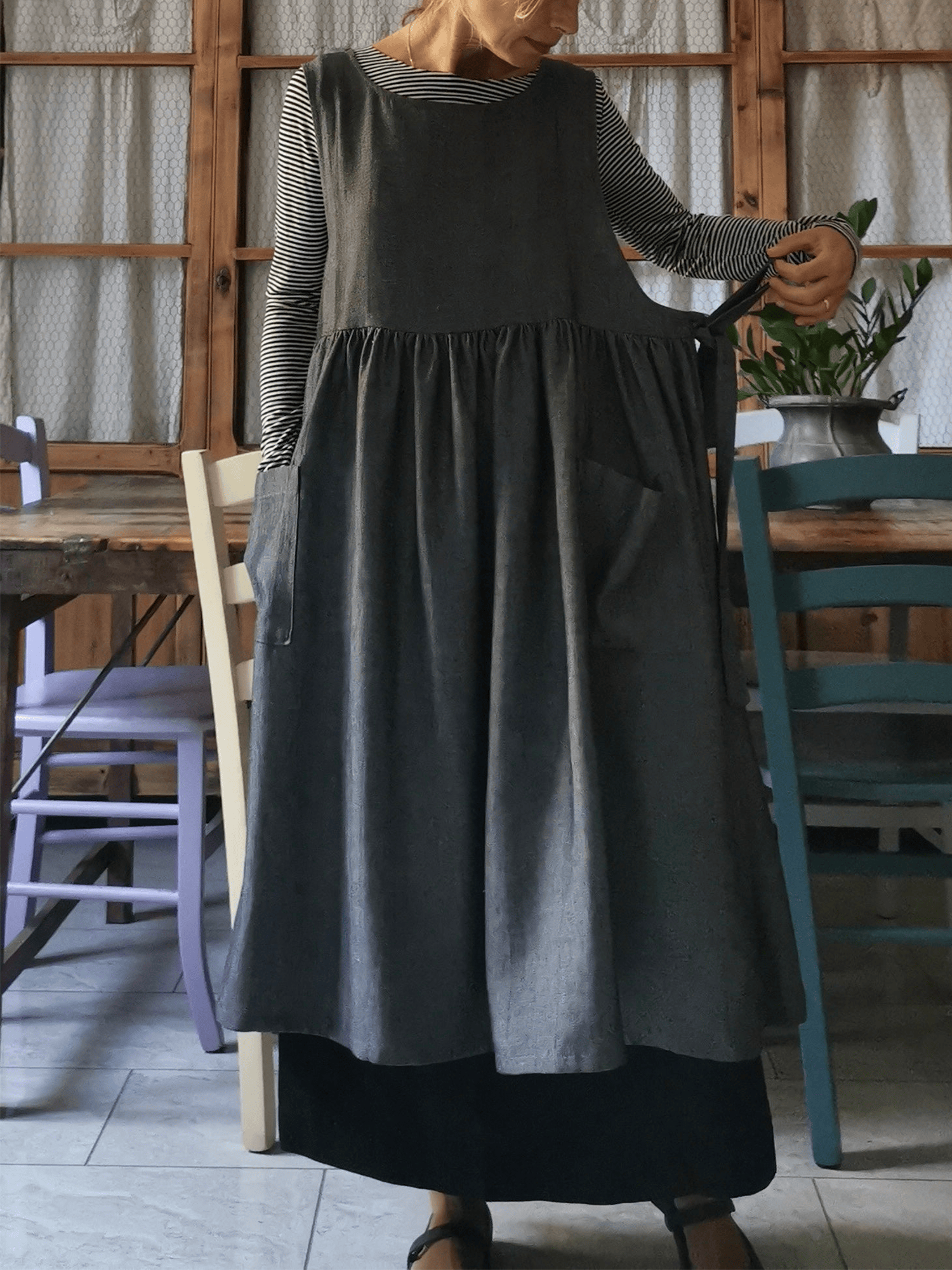 Vintage Grey Green Floral Print Long Apron with Pockets