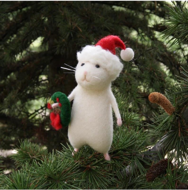This little Christmas mouse is so cute and joyful. He holds a beautiful Christmas wreath in his paw and he has a Christmas hat on his head.