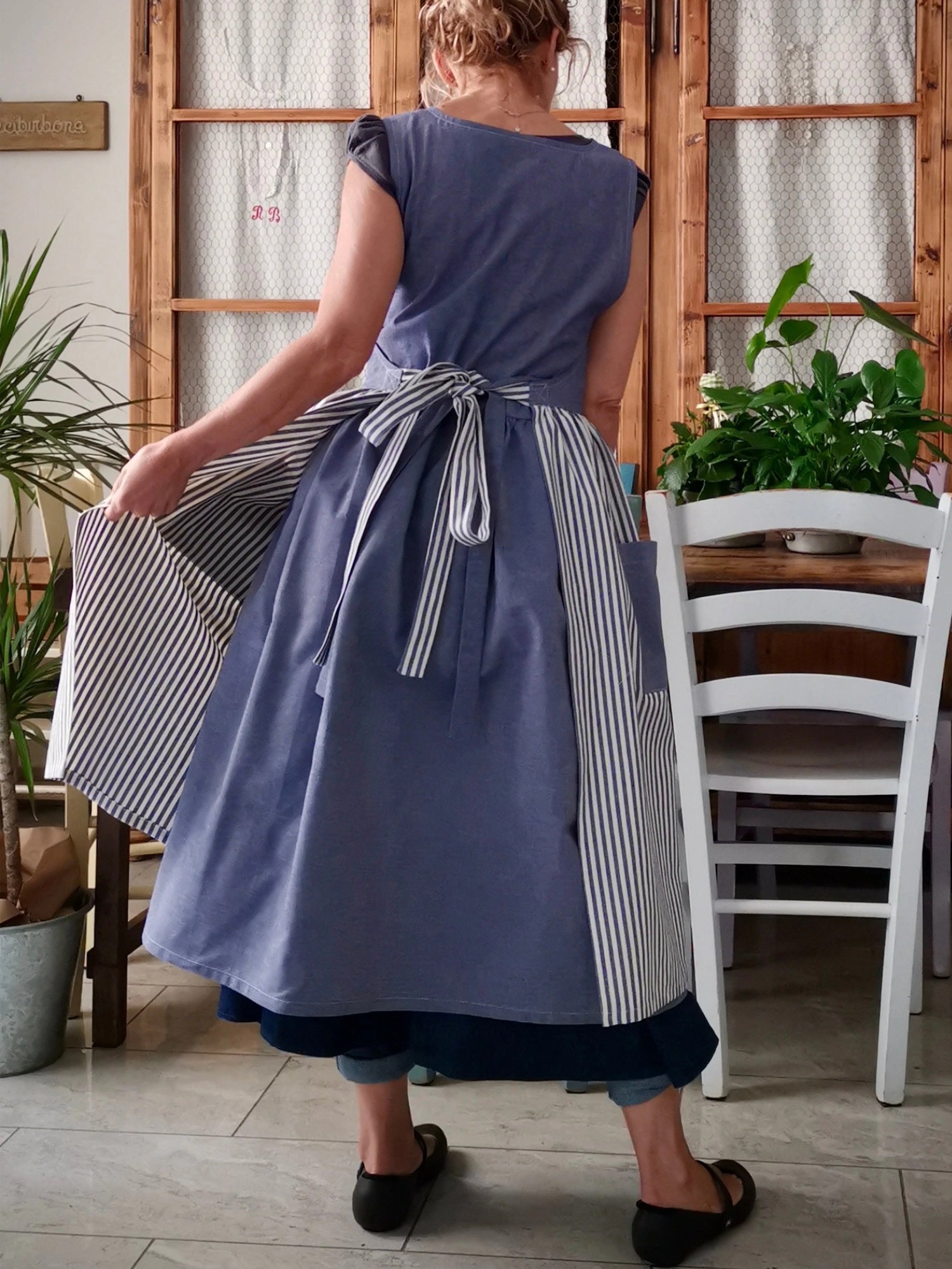 Another apron for the kitchen.... this time in a beautiful, durable cotton with cream and blue stripes, combined with its matching plain blue set.
