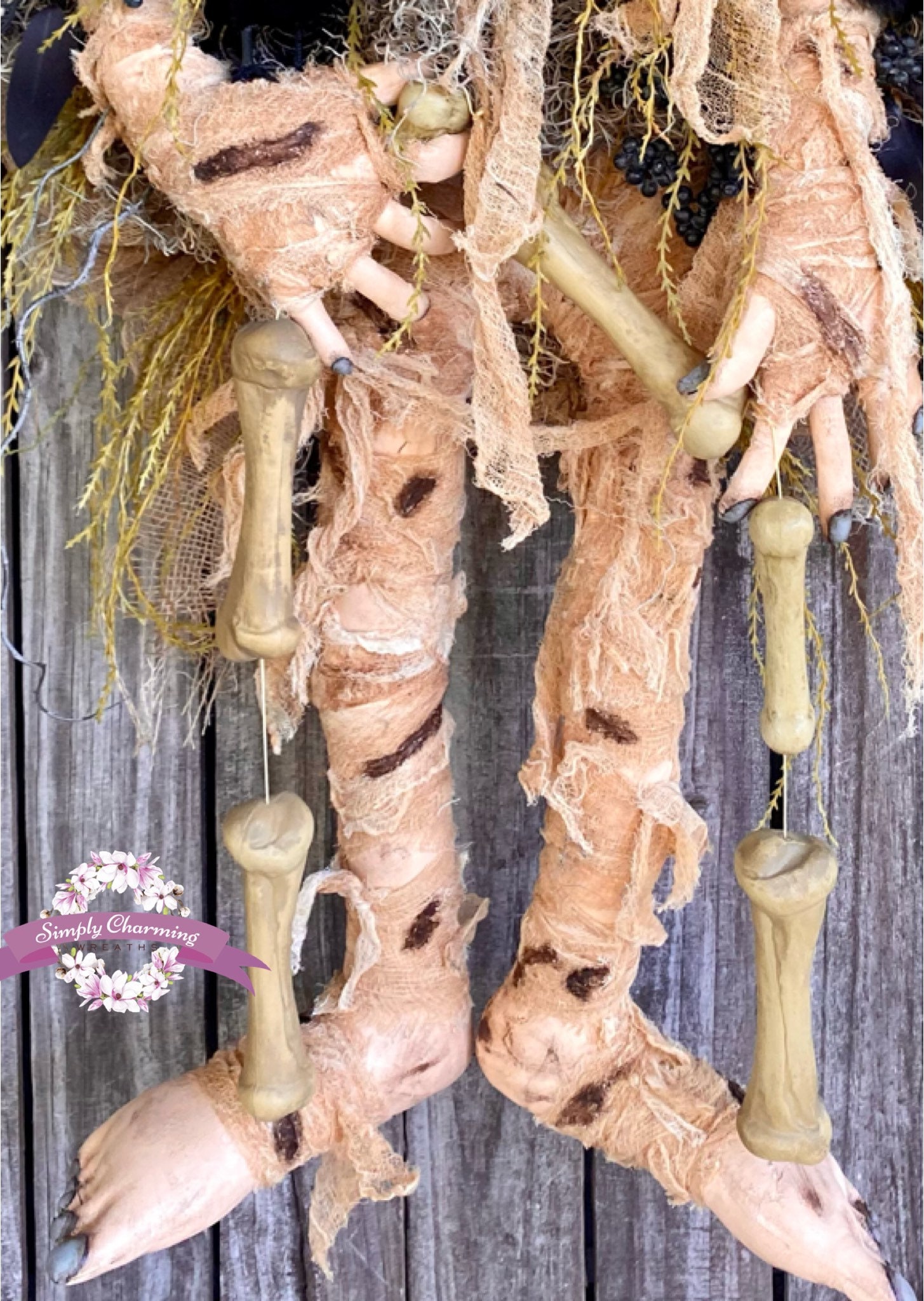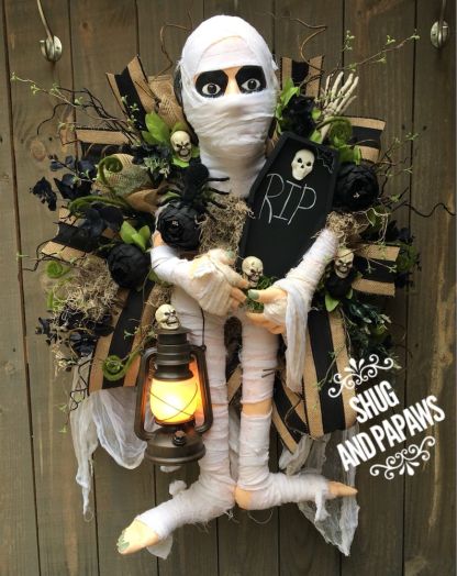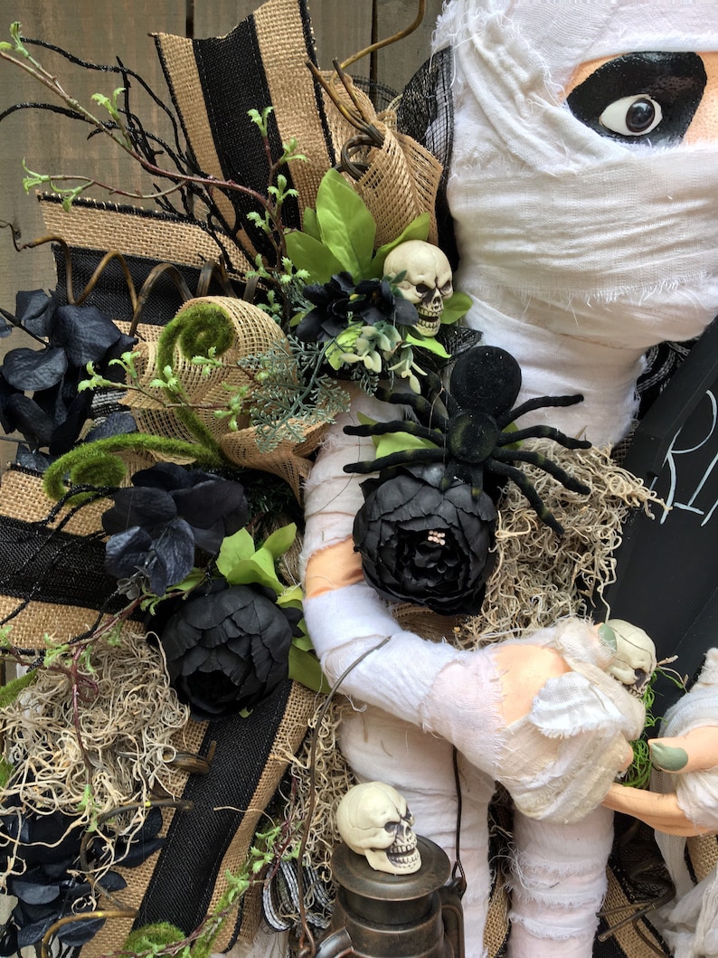 This wreath is Designed using a pine wreath base. Layered in mesh. Accented with burlap ribbon. The Mummy has risen from the grave and surrounded by whispy greenery, creepy vines, black berries and leaves, Spanish moss and streamers of mummy gauze.
