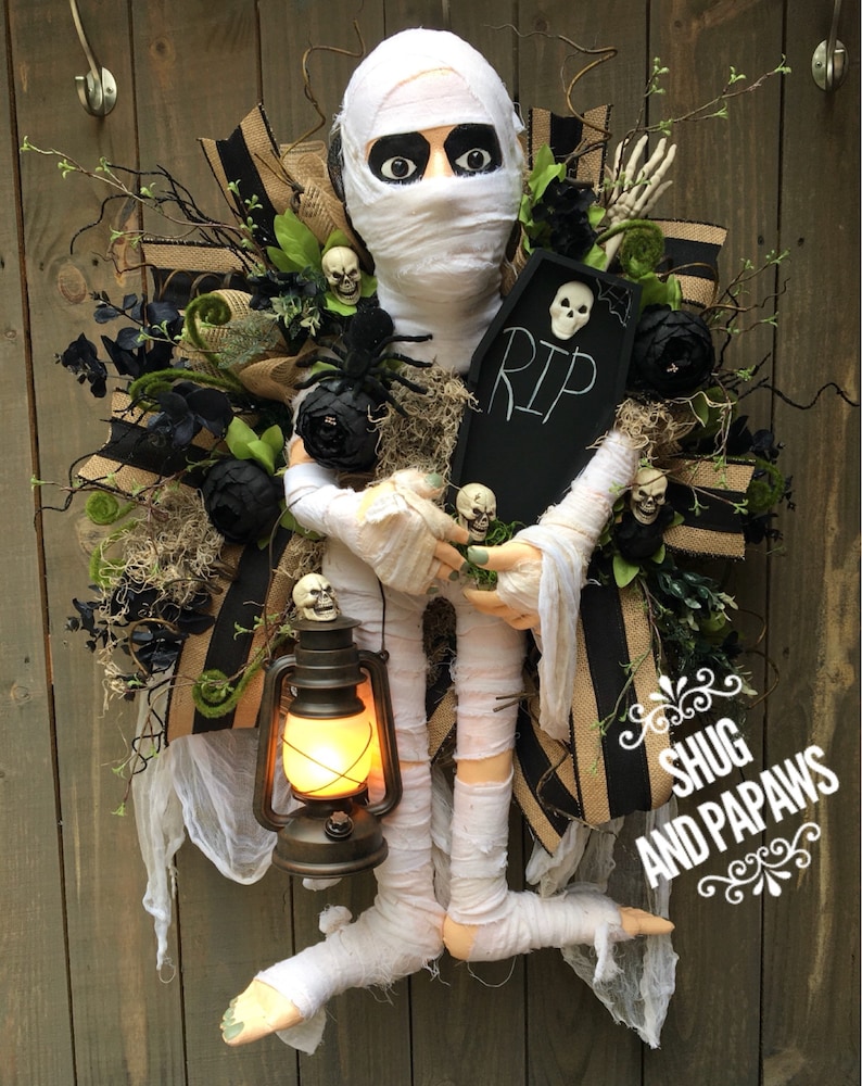 This wreath is made on an oval faux pine wreath base, filled with burlap mesh, designer ribbons, fall florals, greenery, and muslin. Centered is the handmade mummy wreath attachment including head, arm and sign!