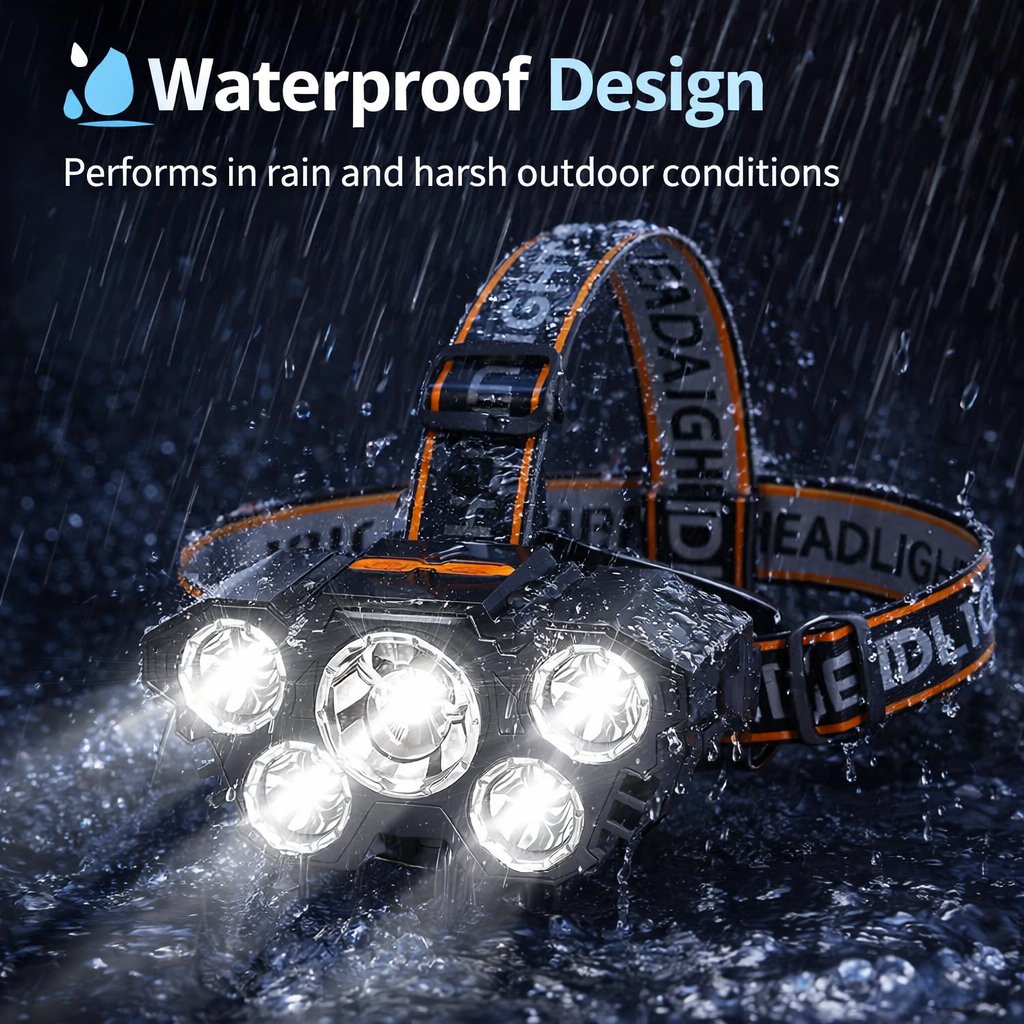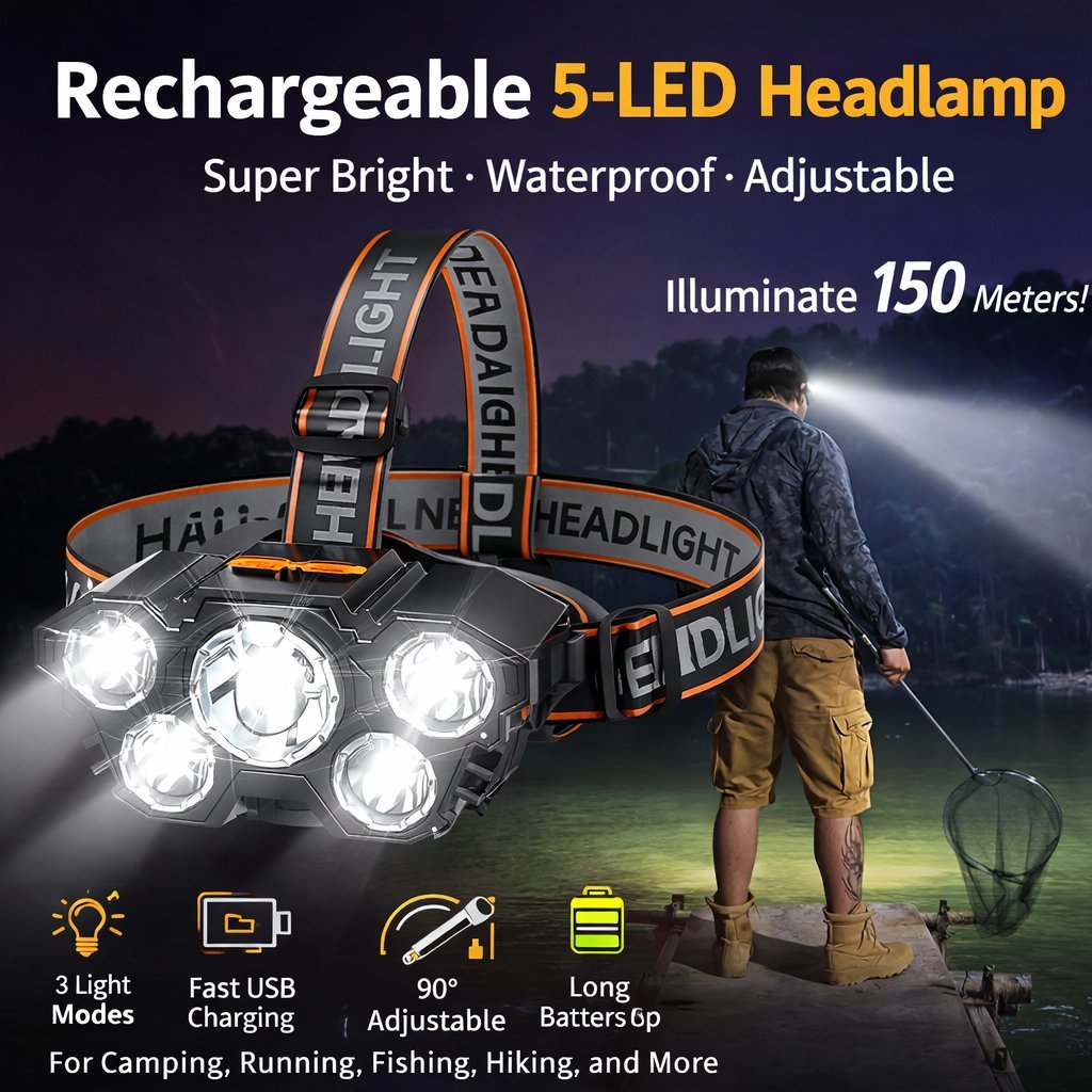 🌙🔦Rechargeable 5-LED Headlamp – Ultra Bright, Waterproof & Adjustable