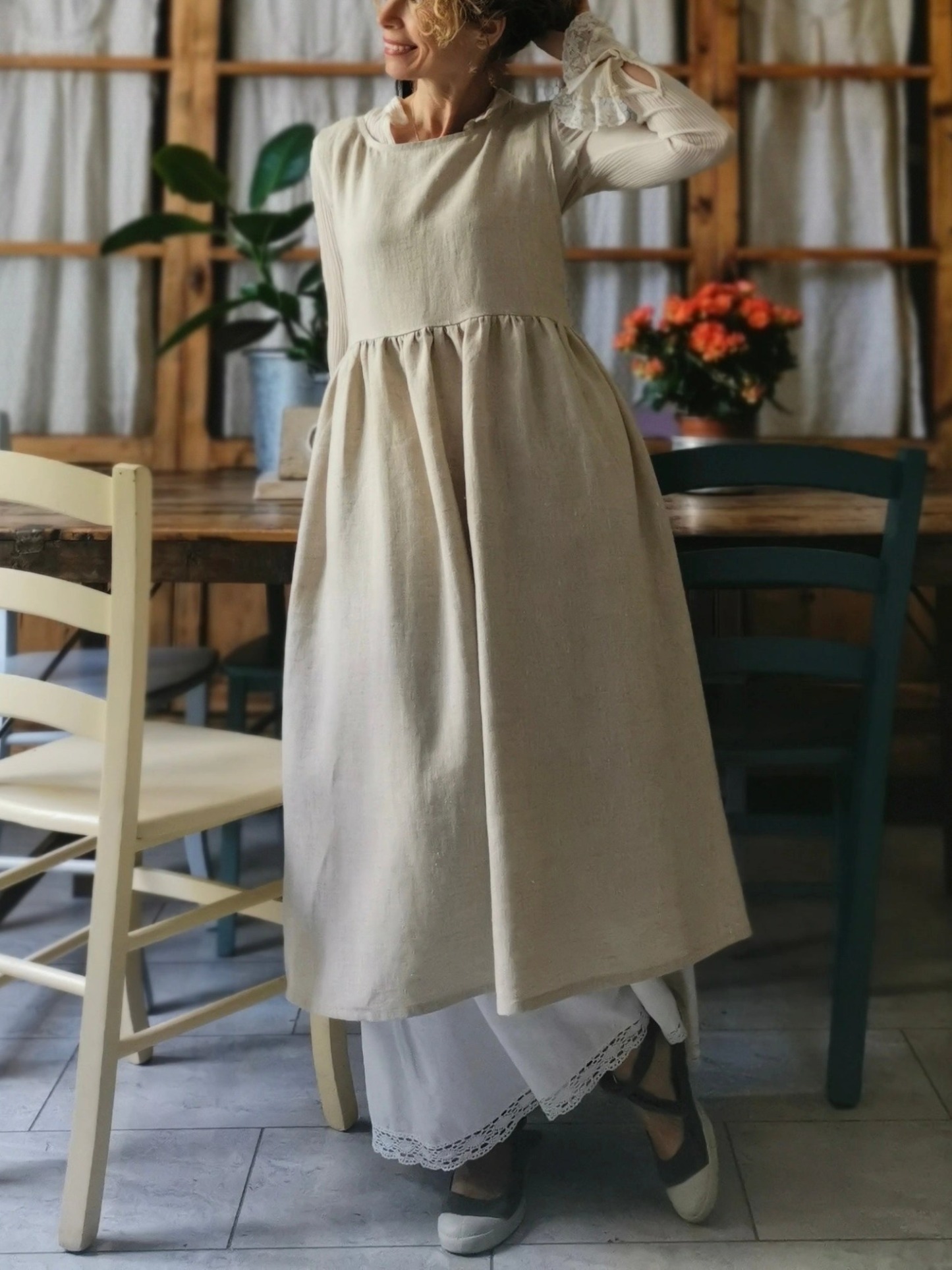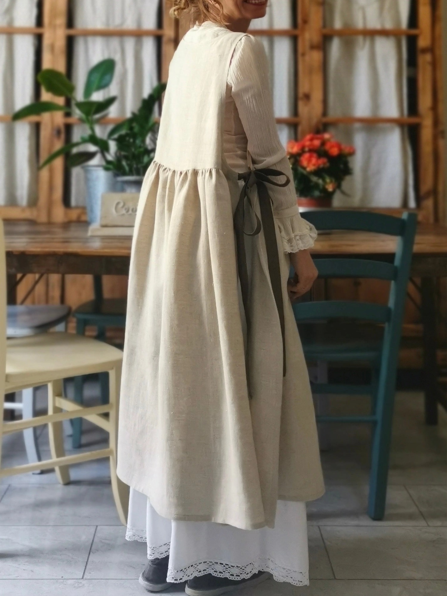 I particularly love this apron, I find it beautiful even for going out of the house, over a vintage fabric skirt, as you can see in the photo or worn over jeans or leggings.