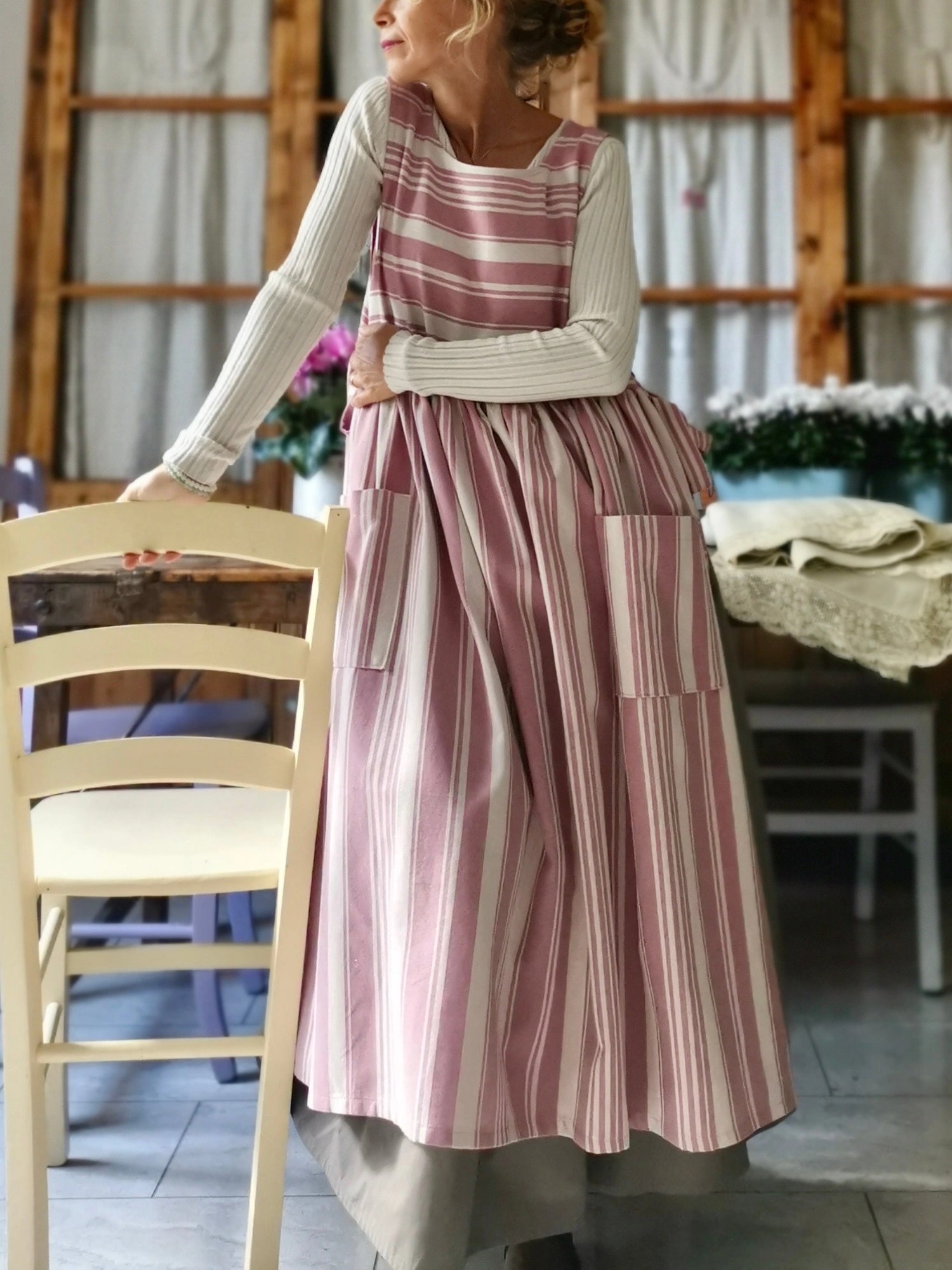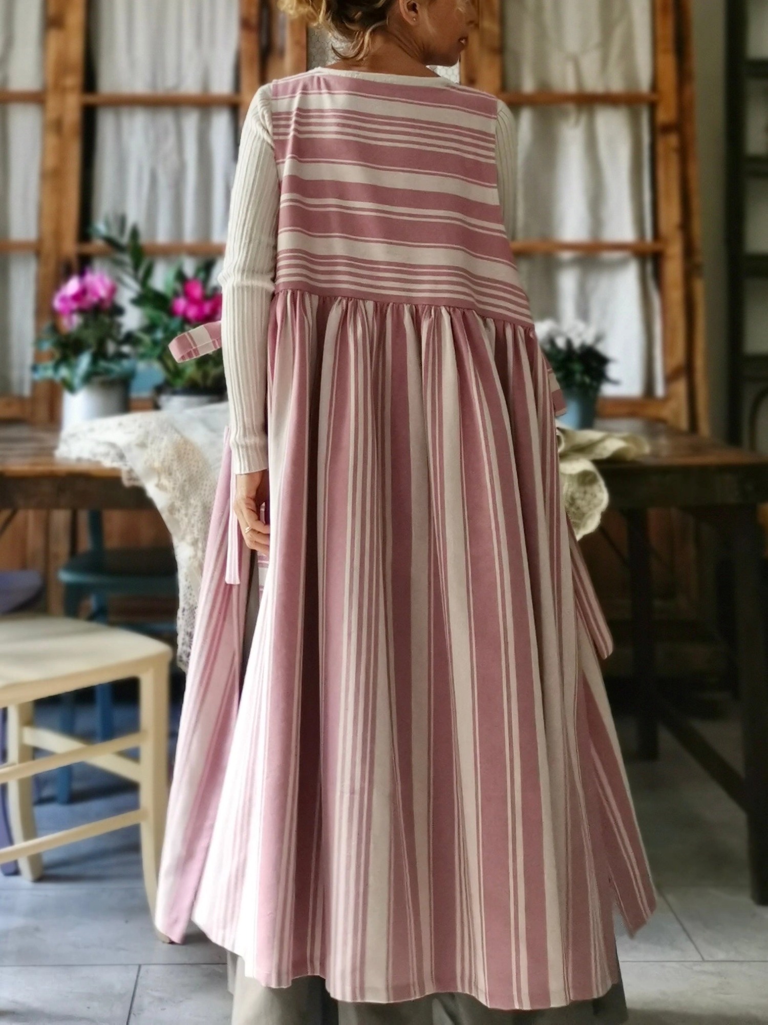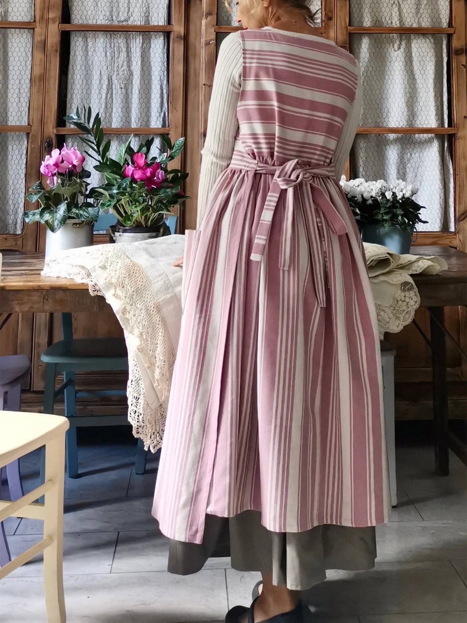 We love this kitchen apron so much...it's made of a beautiful cotton fabric with irregular pink and cream stripes and ties.
