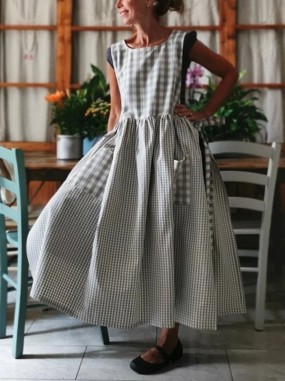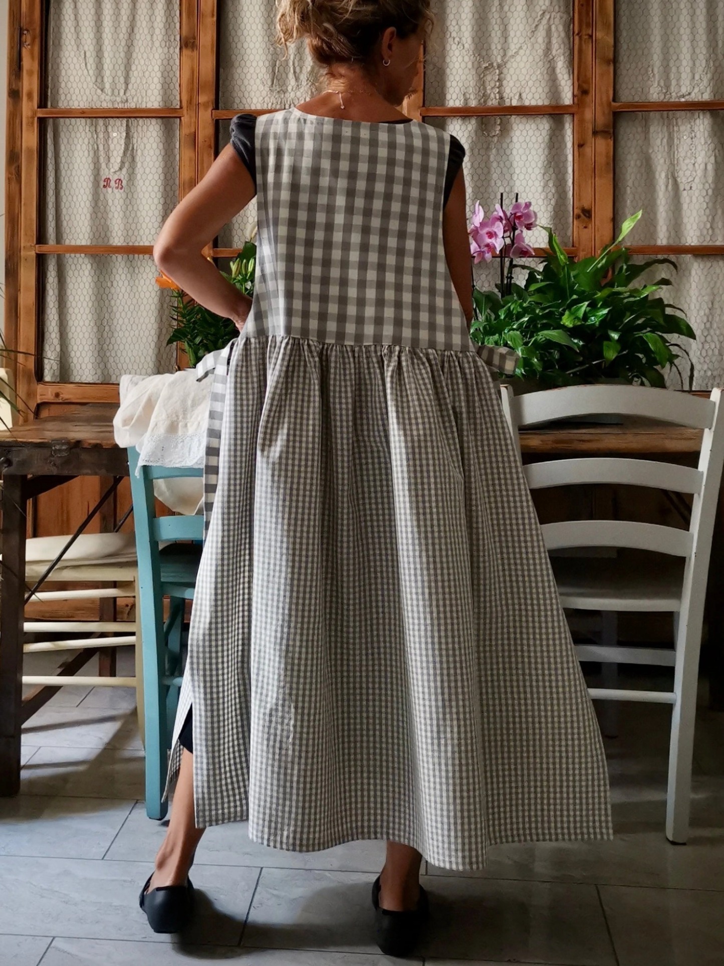 It has a wide bodice, which continues into the two gathered panels of the skirt in a pretty gray checkered cotton, which are connected at the hips by two bows.