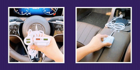 This charger is designed with 4 USB ports, 2 for the front seat, and 2 for the back seat. Using a 5.6ft charging cable, it allows passengers in the back seat and front seat to simultaneously charge their electronic devices. The creative back clip design lets you store long cords and clip them into the back seat pocket without messing up.