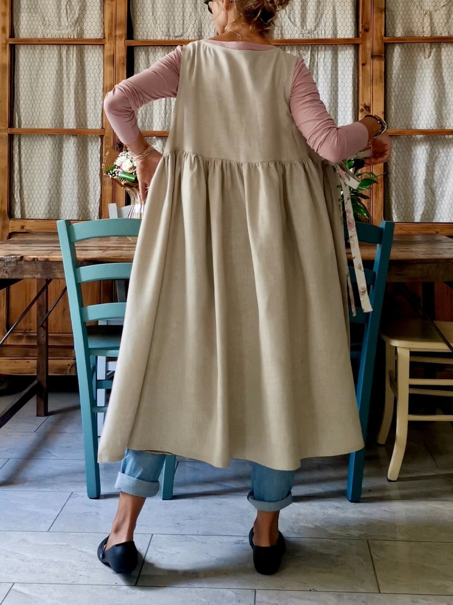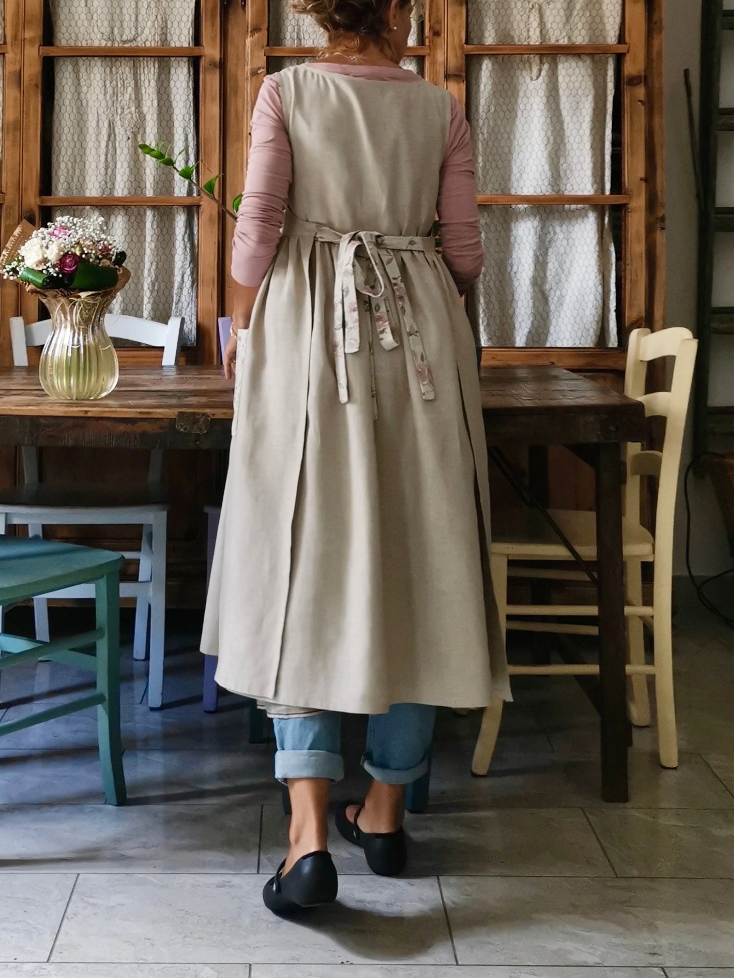 It has a wide bodice that continues into two gathered panels connected at the sides by two bows.