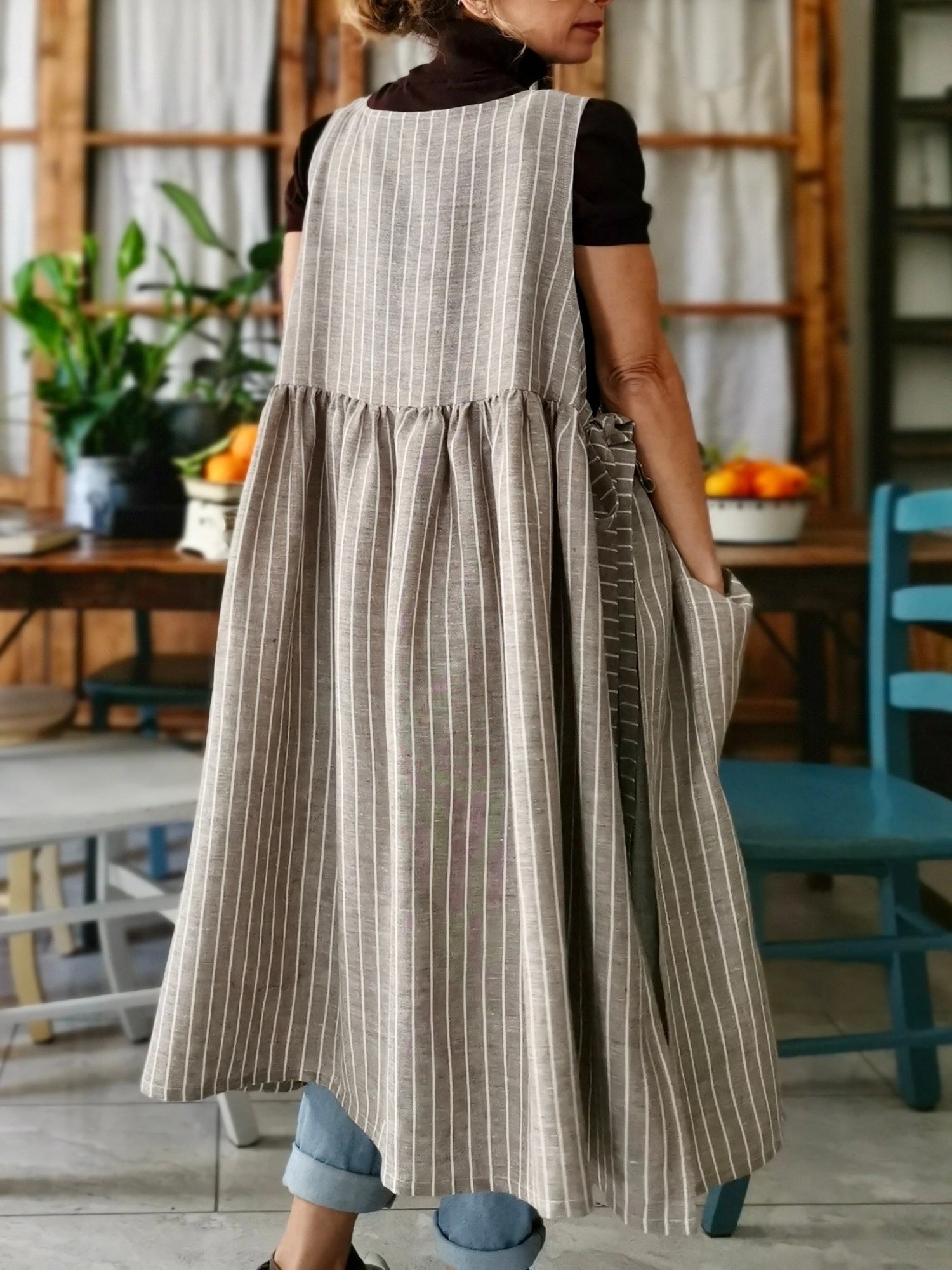 An apron made of a beautiful and soft brown cotton with beige stripes.