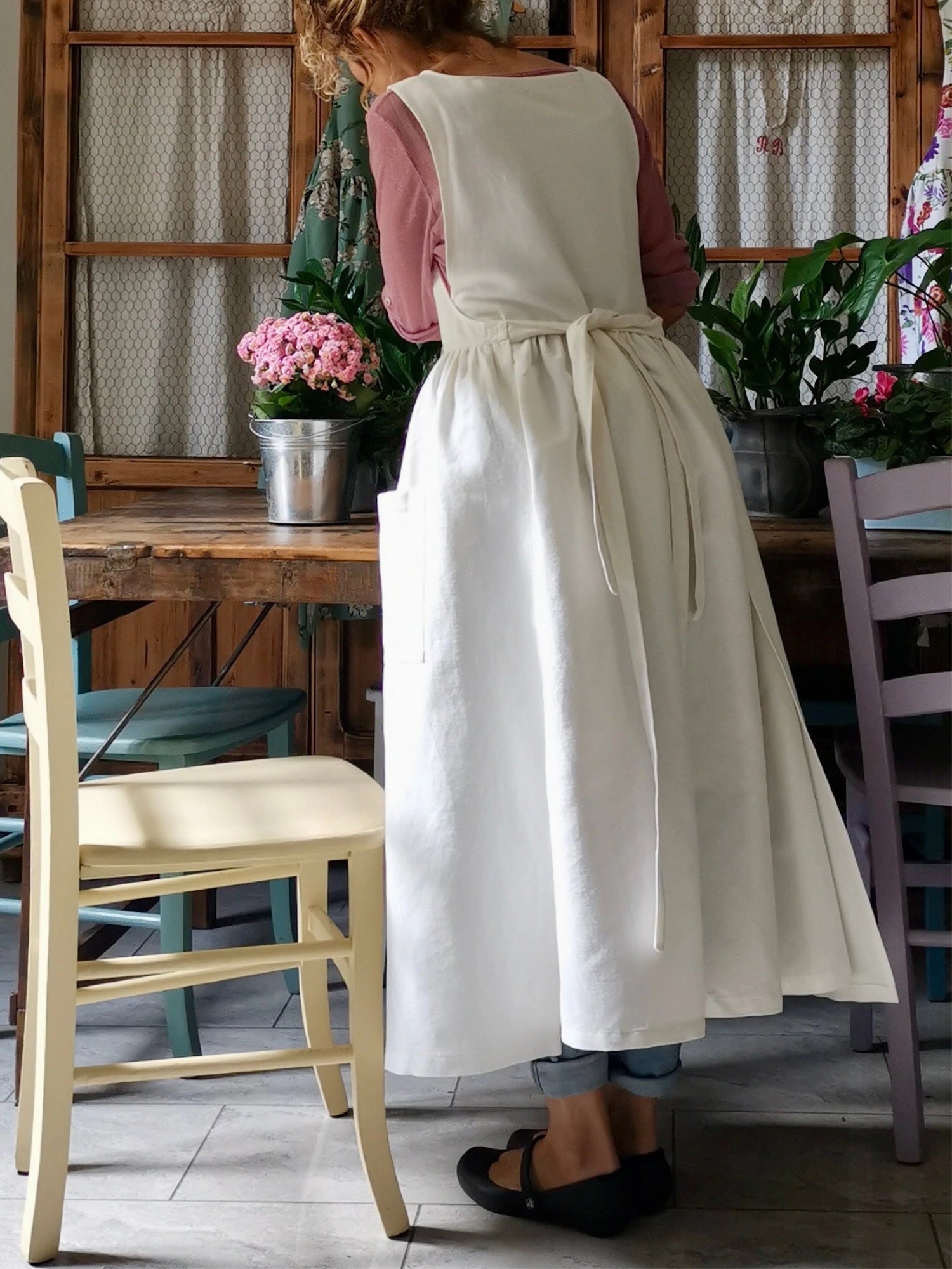 This apron is made of a beautiful cream linen and cotton fabric. Really beautiful, sturdy but comfortable to wear.