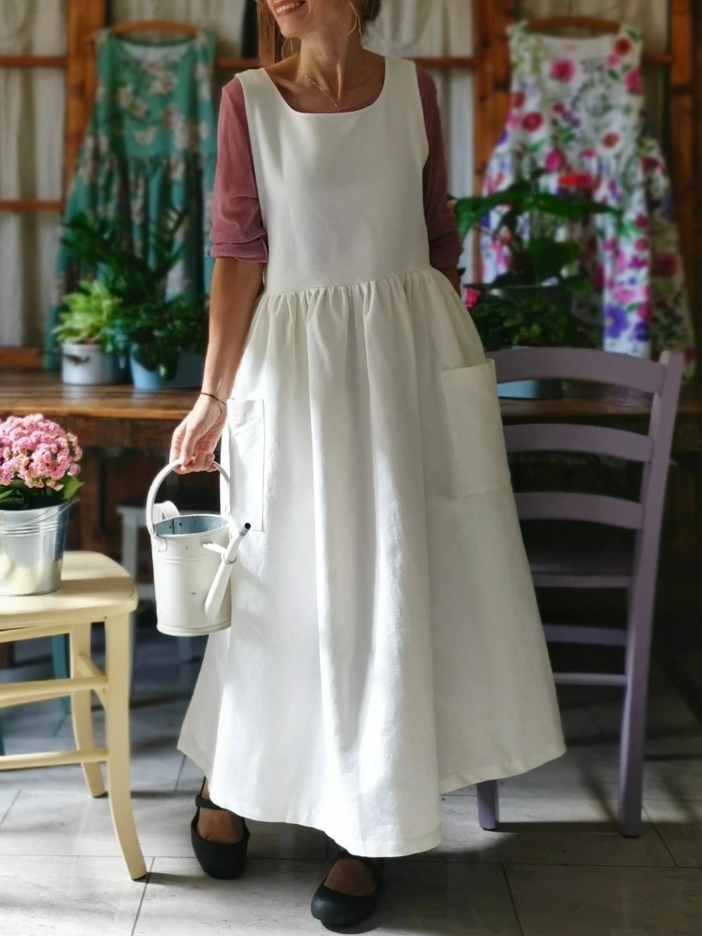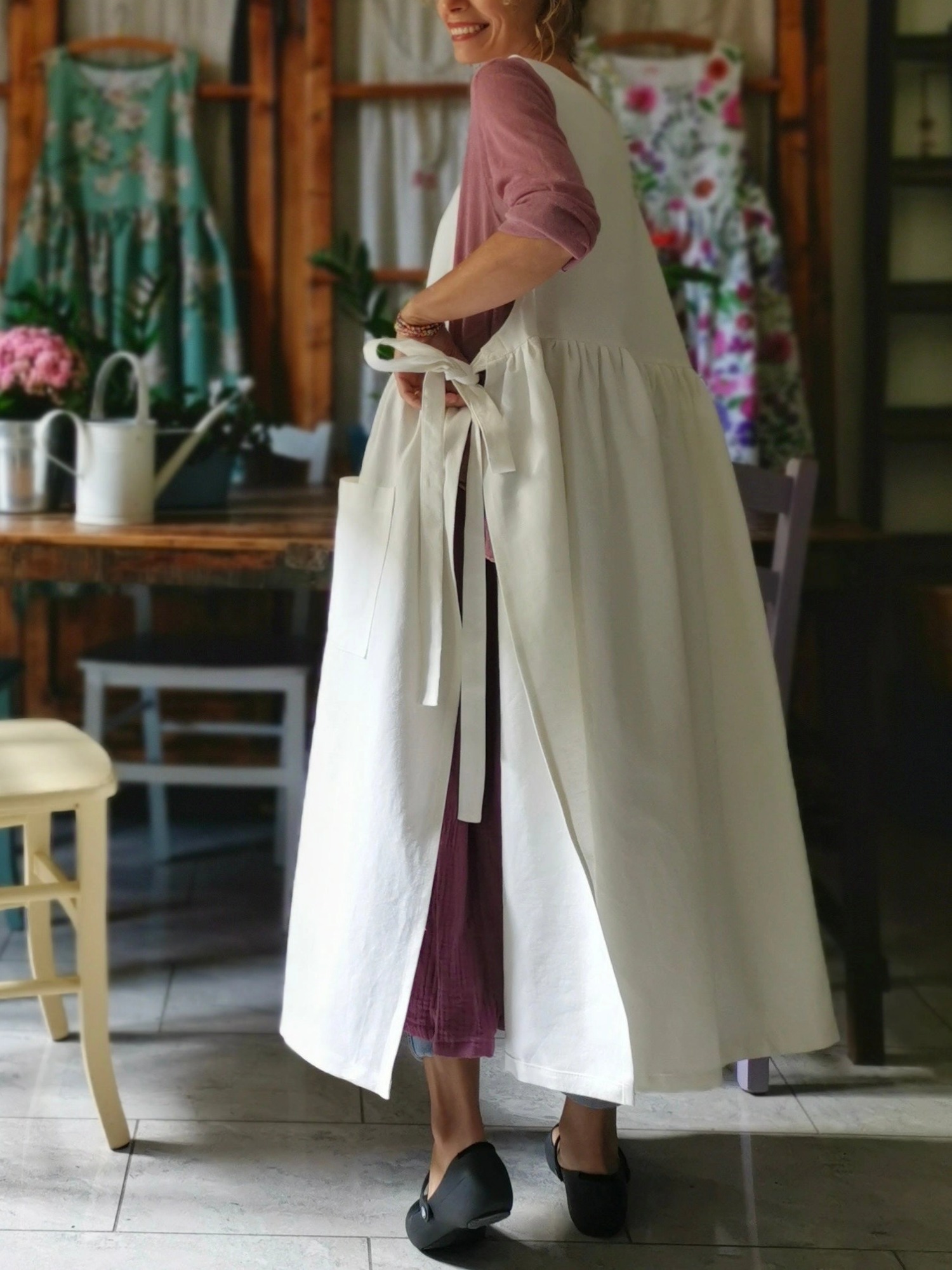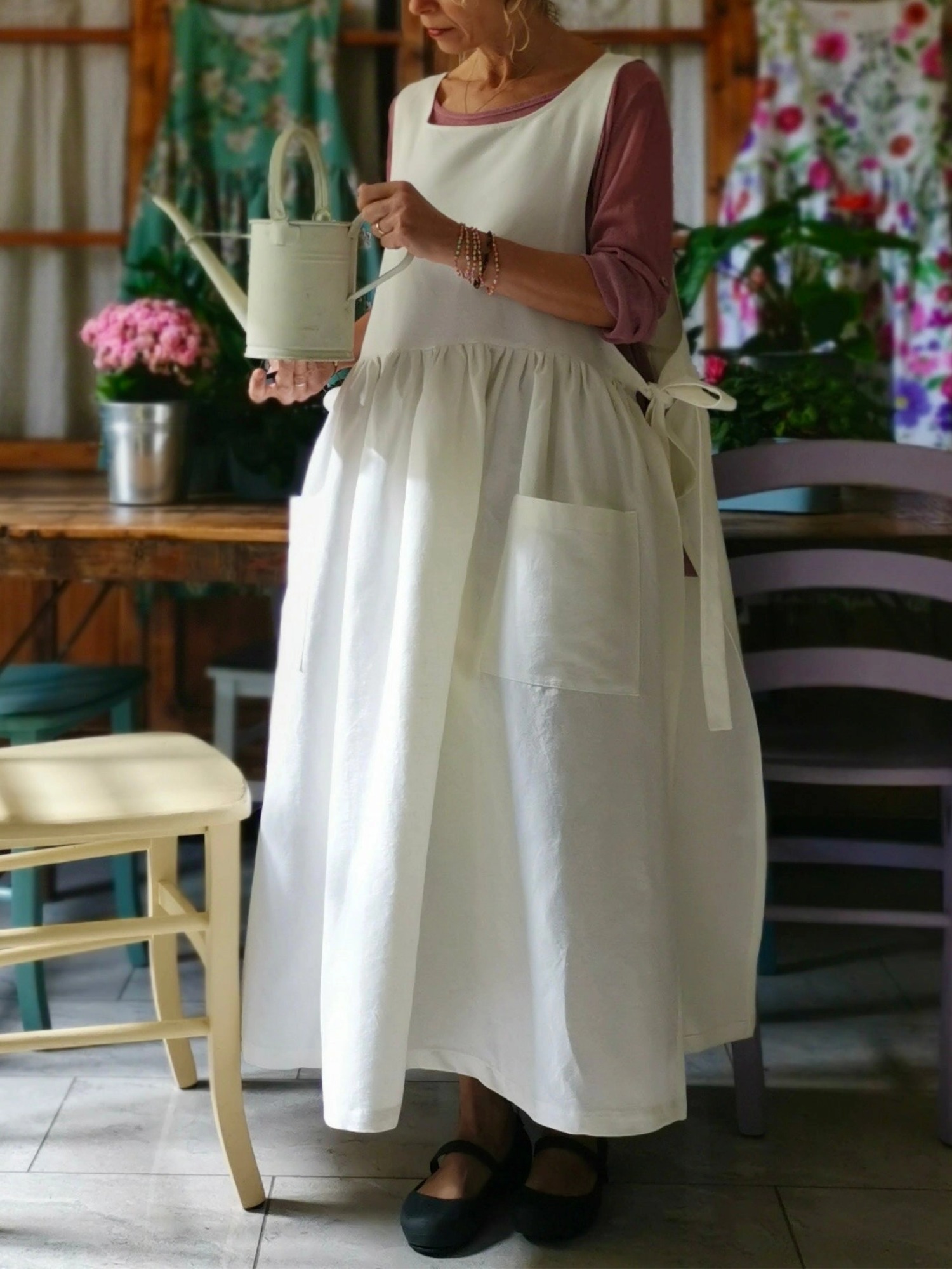 It has a wide bodice that continues in two gathered panels and connected on the sides by two bows. Two comfortable pockets.