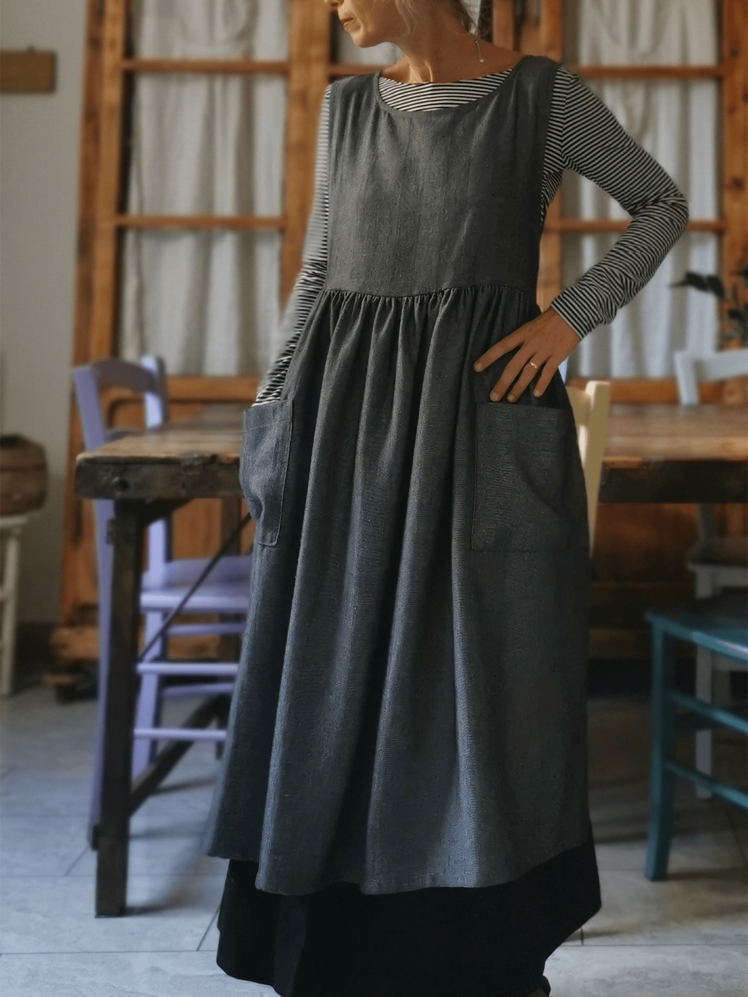 Grey Herringbone Linen Apron with Pockets