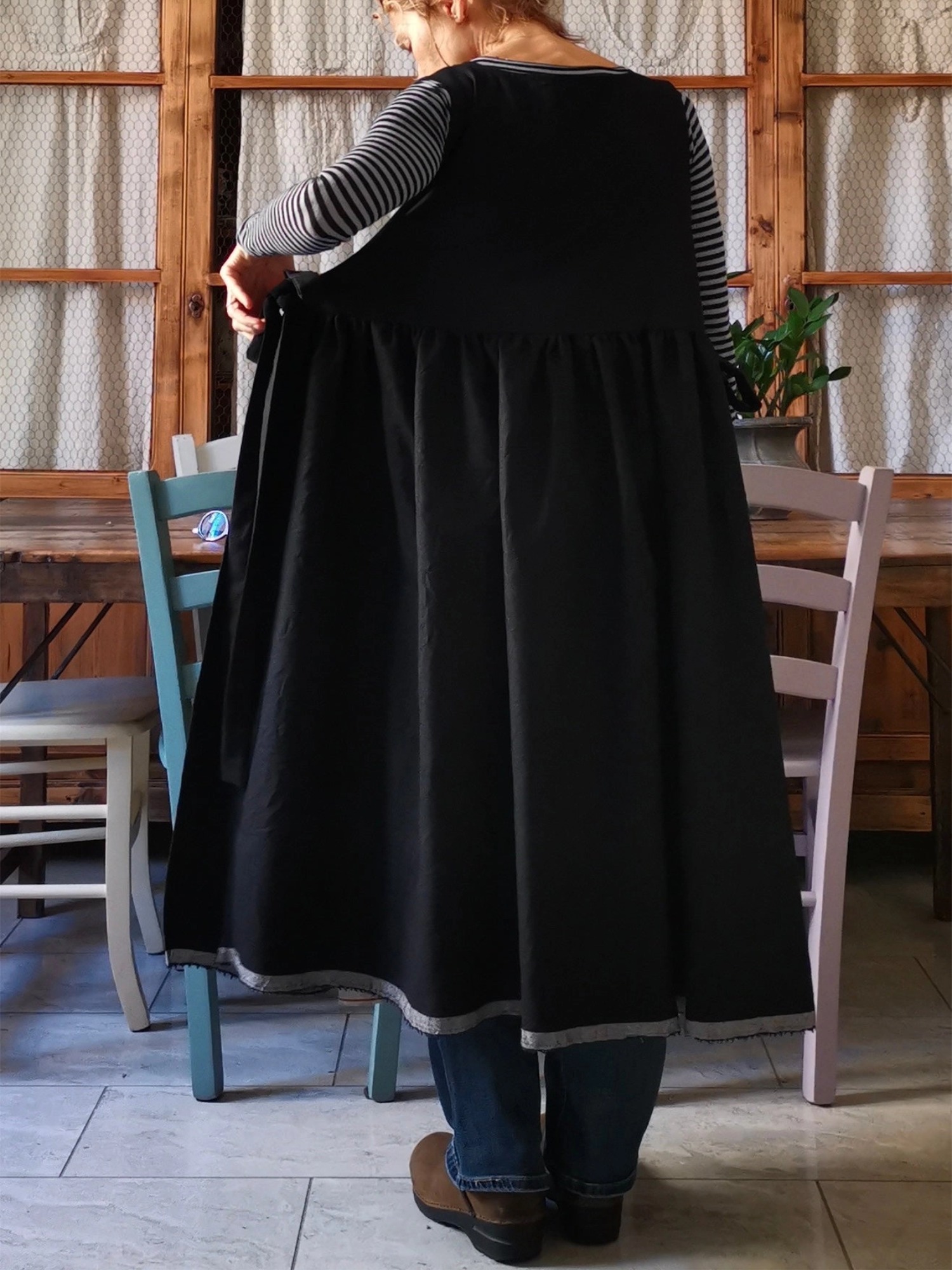It has a wide bodice that continues in two gathered panels and connected on the sides by two bows. It has two comfortable front pockets.