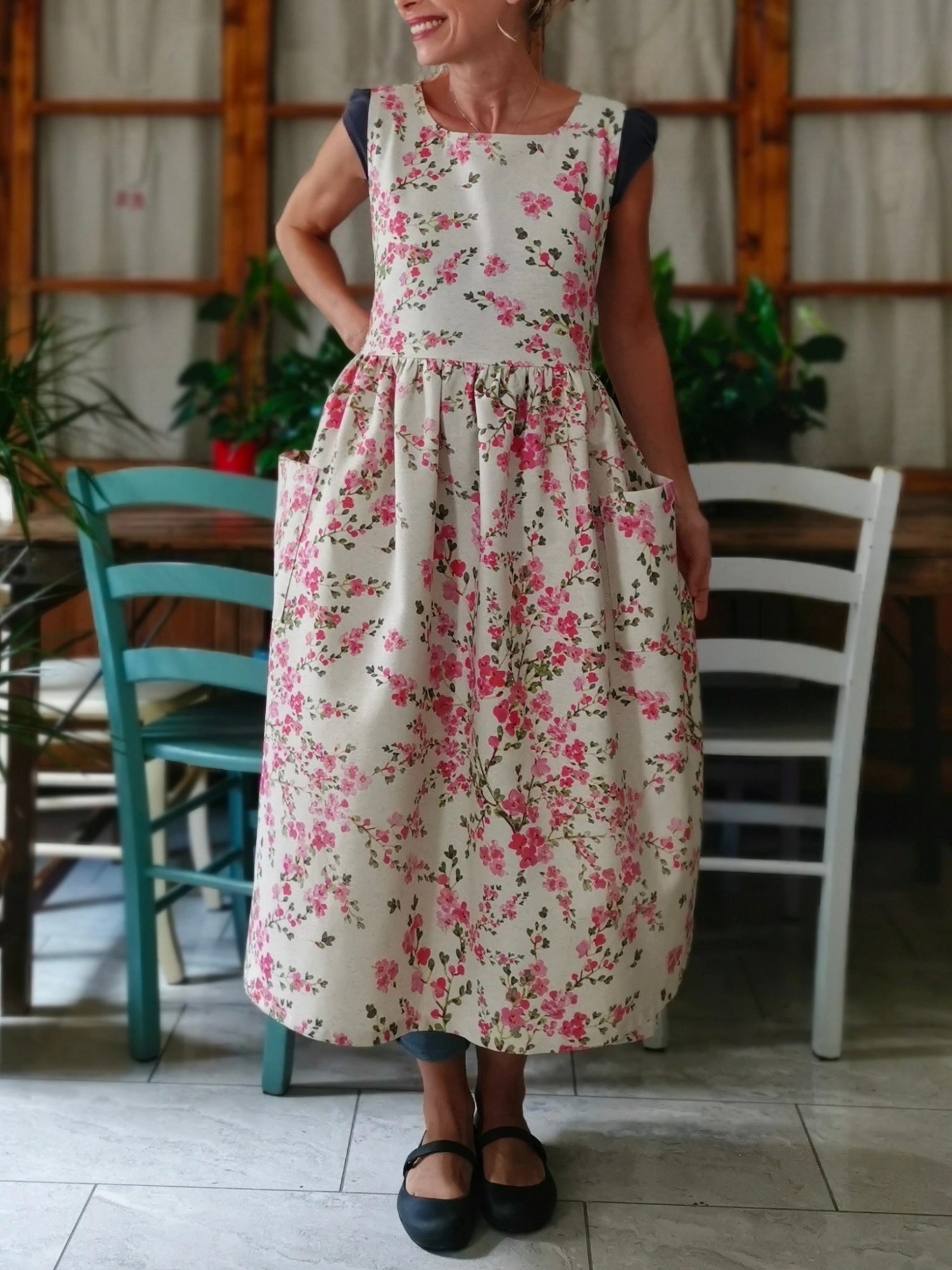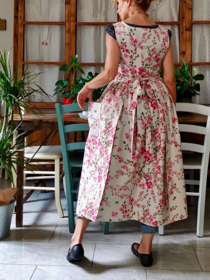 This apron is made of a beautiful beige cotton fabric, printed with pink flowers, with an evident texture. A fabric of clear oriental inspiration.