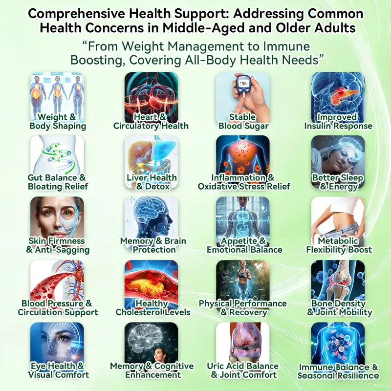 Benefits: Supports effective weight reduction and appetite regulation, stabilizes blood glucose levels, promotes cardiovascular health, reduces chronic low-grade inflammation, and helps alleviate metabolism-related fatigue.