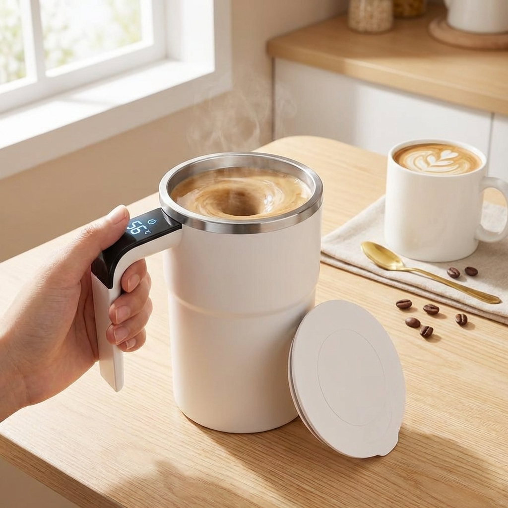 An integrated magnetic stirrer mixes the beverage evenly. Sugar, milk, or powder dissolve without manual stirring.