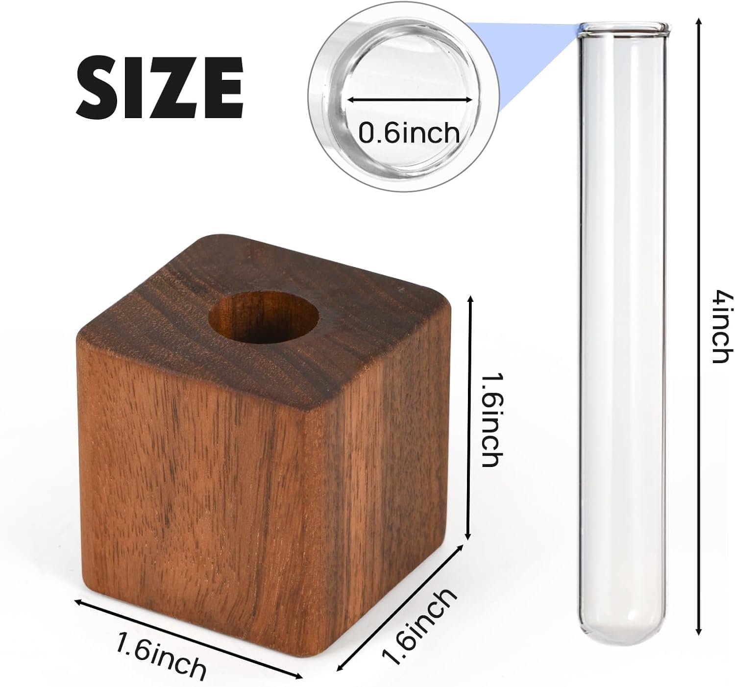 Each wooden block measures approx 1.57 inches per side, paired with a 3.94 inch tall clear test tube. The perfectly sized tube is ideal for single flower stems, fresh plant cuttings, small sprigs, or hydroponic plants—letting you add tiny pops of greenery and color to even the smallest, tightest spaces.